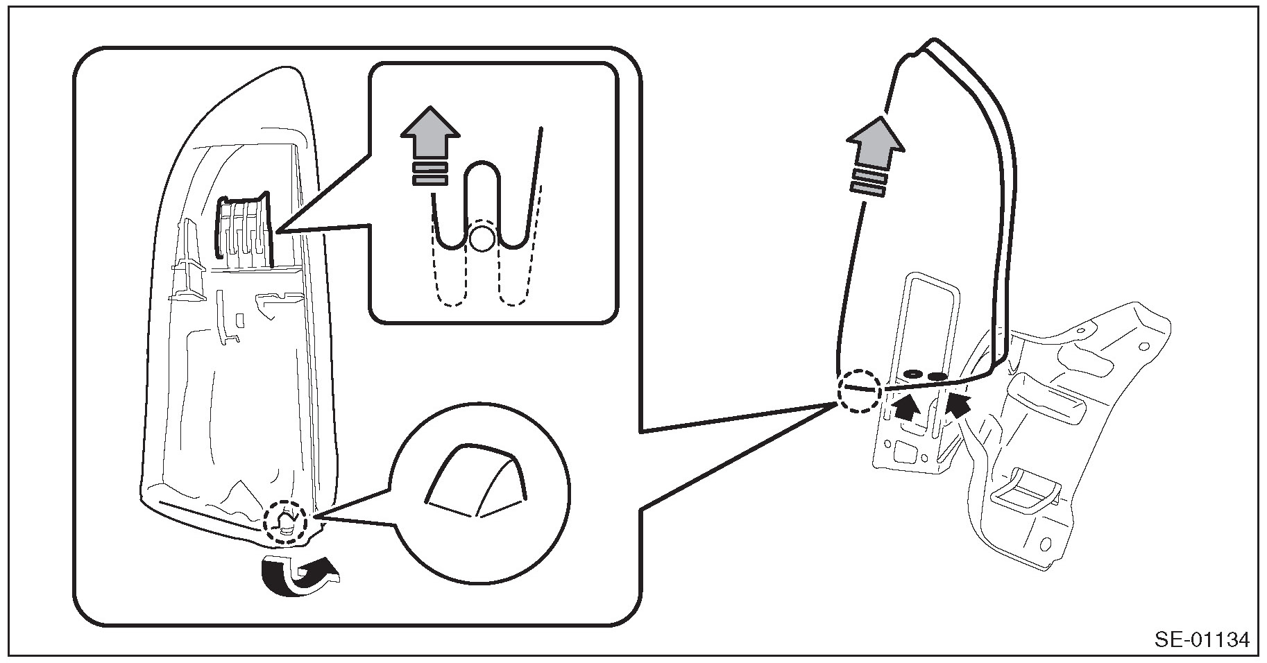 CAUTION: If the hook is disconnected from the vehicle body, replace the hook with the new part to prevent the decline of the fixed force of the seat.