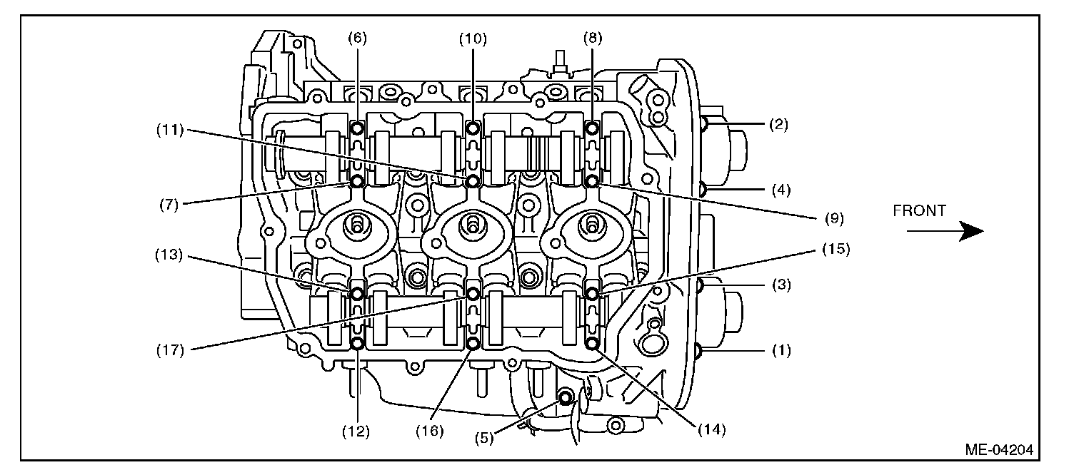 10) Loosen the camshaft cap bolts equally, a little at a time in numerical sequence, as shown in the figure.