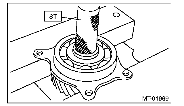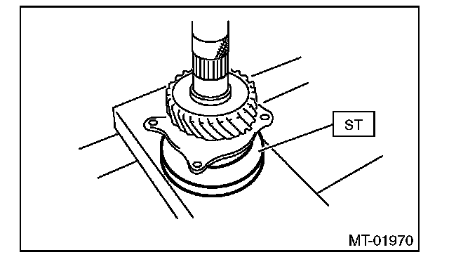 2) Set the ST to the bearing inner race, then install the transfer drive gear to the bearing.