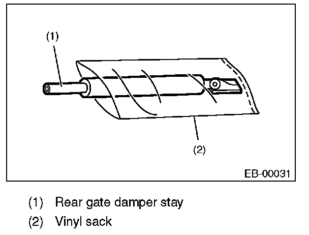 Drill a hole of 2 to 3 mm (0.08 to 0.12 in) diameter at a point 10 to 200 mm (0.39 to 7.87 in) from the body side, and bleed the gas in the rear gate damper stay completely.