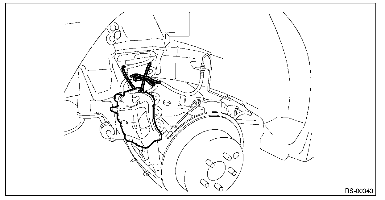 (3) Prepare wiring harnesses etc. to be discarded, and suspend the rear disc brake caliper from the shock absorber with the harnesses.