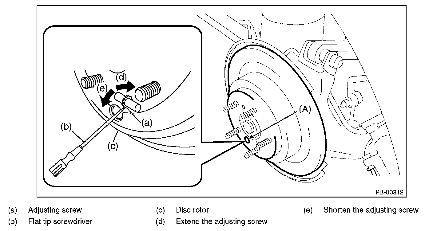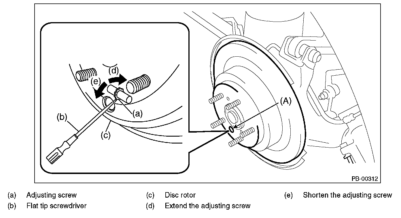 (1) Remove the adjusting hole cover (A), insert the flat tip screwdriver, and rotate the adjusting screw until the brake shoe moves far enough to remove the disc rotor.