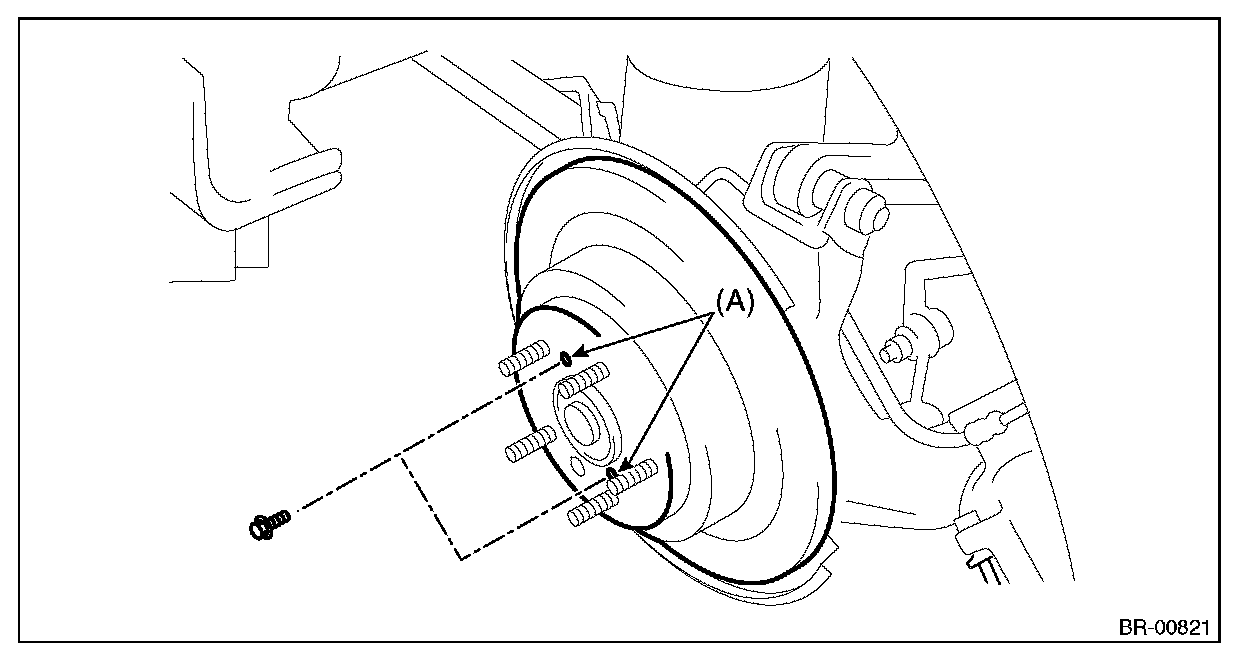 (2) When the disc rotor is difficult to be removed from the rear hub unit bearing, screw in 8 mm (0.31 in) bolt to the threaded part of the disc rotor (A), and remove the disc rotor.