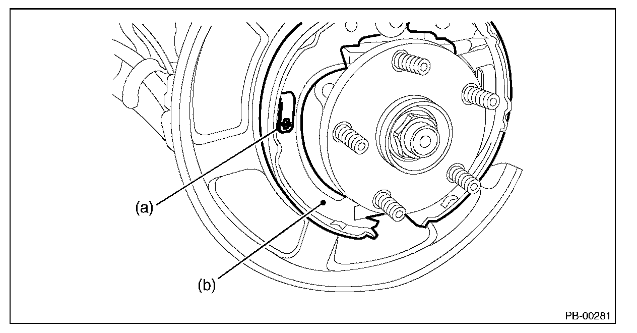 (1) Remove the shoe hold-down spring (a) and the shoe hold-down pin, and remove the parking brake shoe (primary) (b).