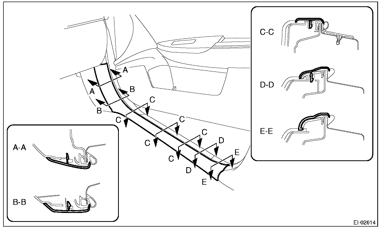 2. Turn over the floor mat and release the claw (C-C) by accessing from behind the side sill cover INN.