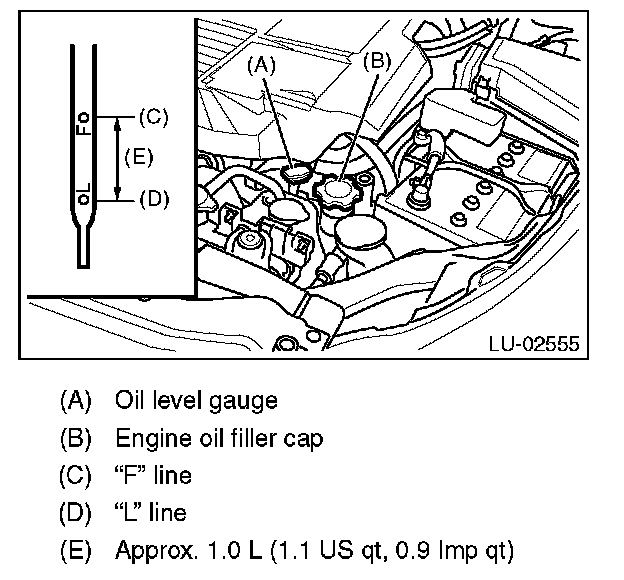 11) After the engine stops, recheck the oil level. If necessary, add engine oil up to the "F" line on level gauge.