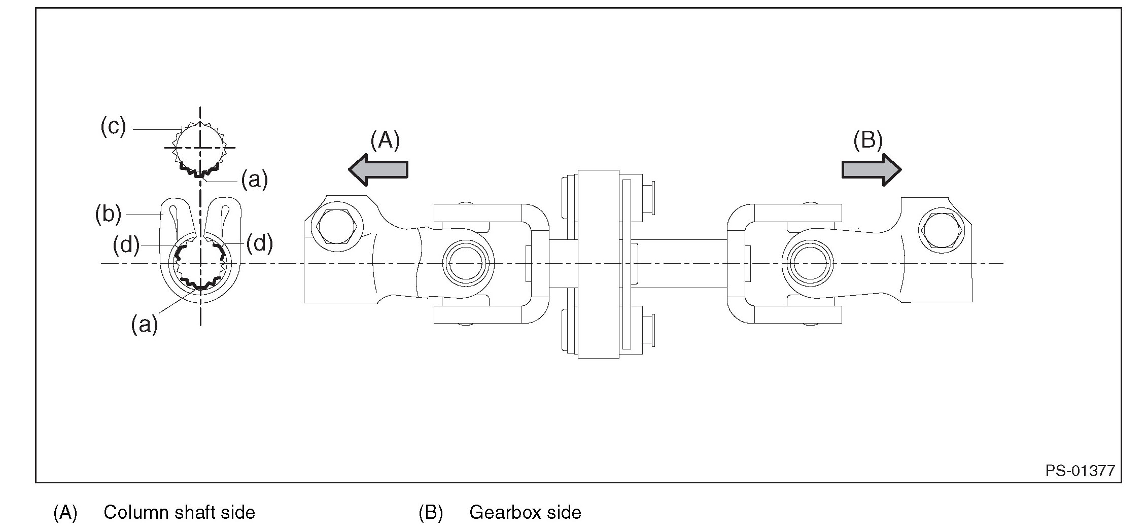 Be sure to align the protrusion section (a) of the column shaft side with the cutout (a) of the serration. If the protrusion is aligned with the other cutout (d), the universal joint bolt cannot be assembled.