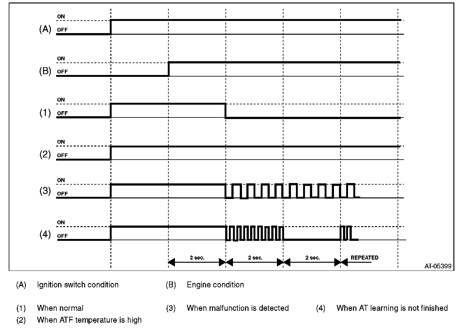 AT OIL TEMP light repeats "Blinking at 4 Hz to Turning OFF" every two seconds, when the AT learning is not finished with engine ON. In this case, perform the "Learning". (During AT learning, the light blinks at 2 Hz or illuminates.) Programming and Relearning