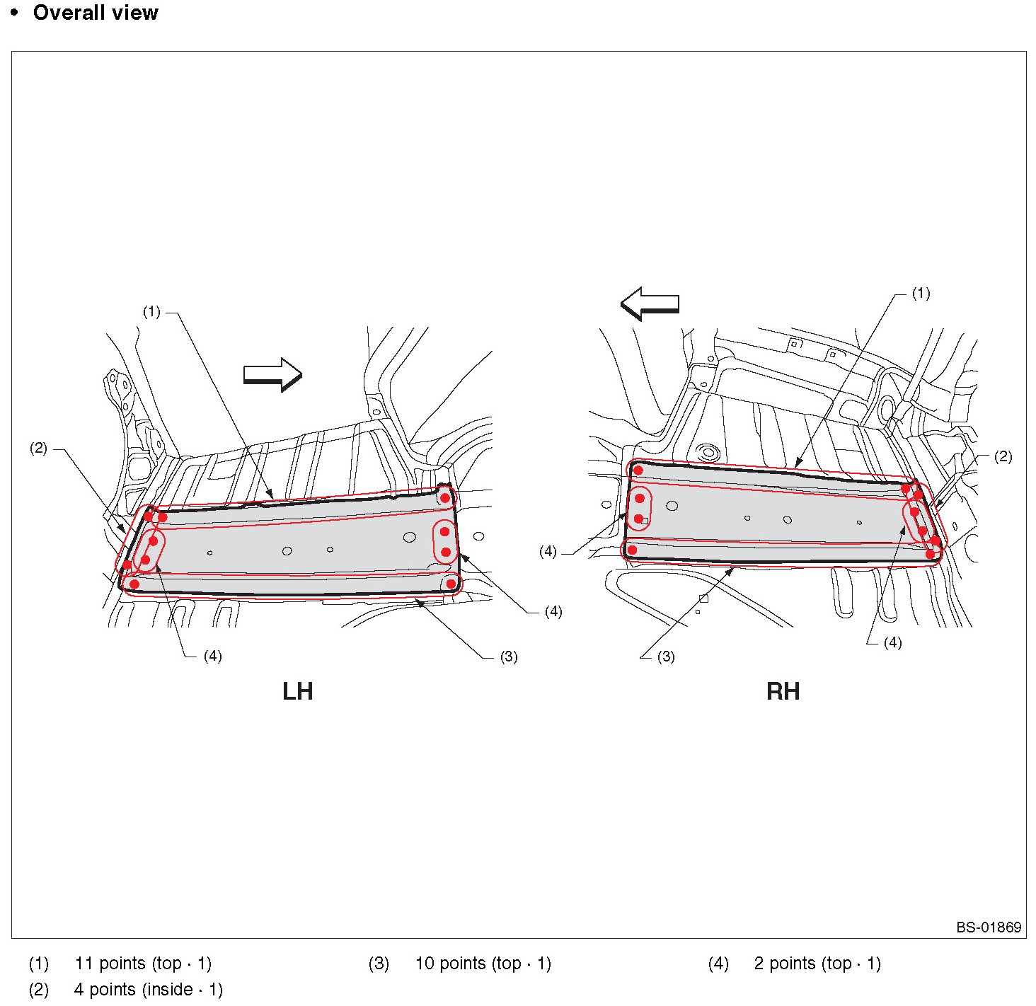 - Symbols and number of points indicate the welding method and the number of welding points. Text in brackets indicate the direction of removal for welded parts, and numbers indicate the number of panels to be drilled to remove welded sections of panels.