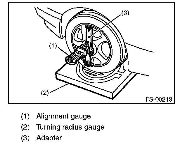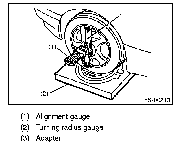 1) Place the front wheel on the turning radius gauge. Make sure the ground contact surfaces of the front and rear wheels are at the same height.