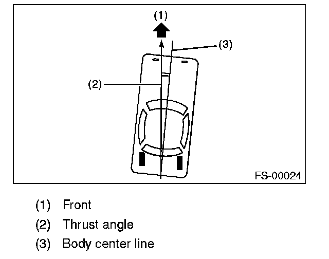 Thrust angle is a mean value of left and right wheel toe angles in relation to the vehicle body center line. Vehicle is driven straight in the thrust angle direction while slanting in the oblique direction depending on the degree of the mean thrust angle.