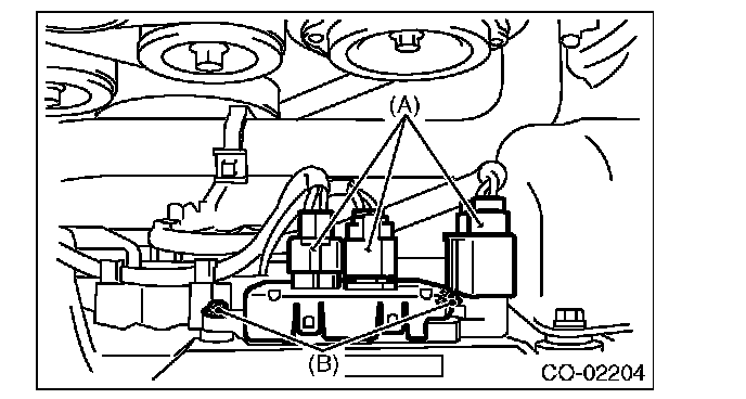 (2) Remove the screws (B) holding the radiator fan control unit.