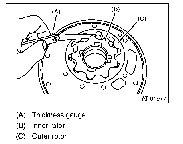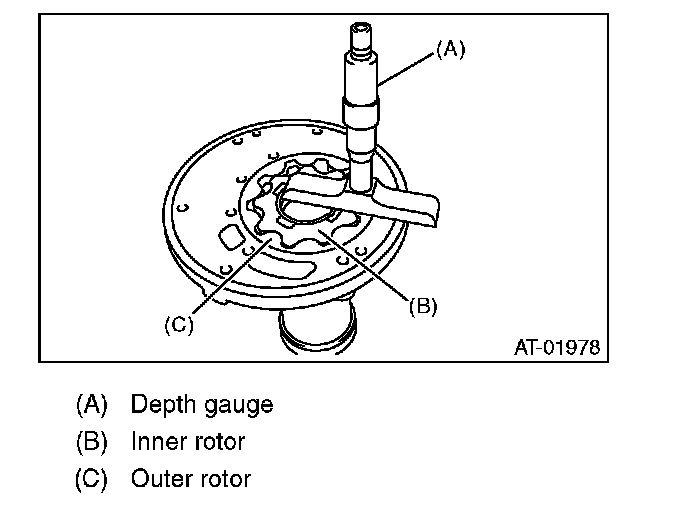 Set a depth gauge to oil pump housing, then measure the oil pump housing-to-rotor clearance.