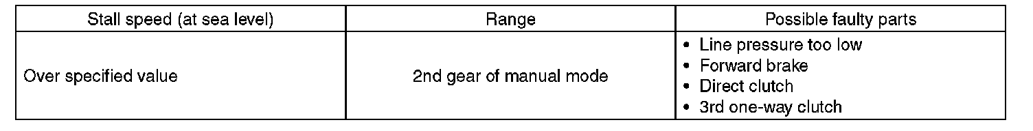^ If the stall speed is higher than the specified range, attempt to finish the stall test in as short a time as possible, in order to prevent the automatic transmission from sustaining damage.