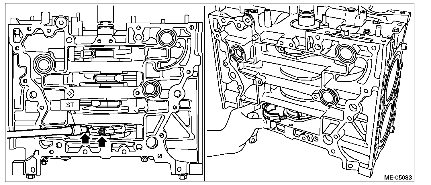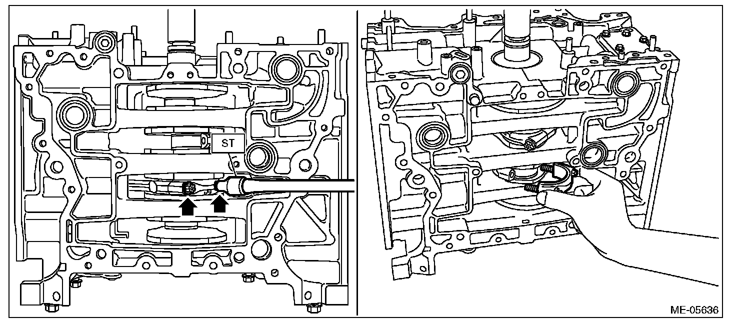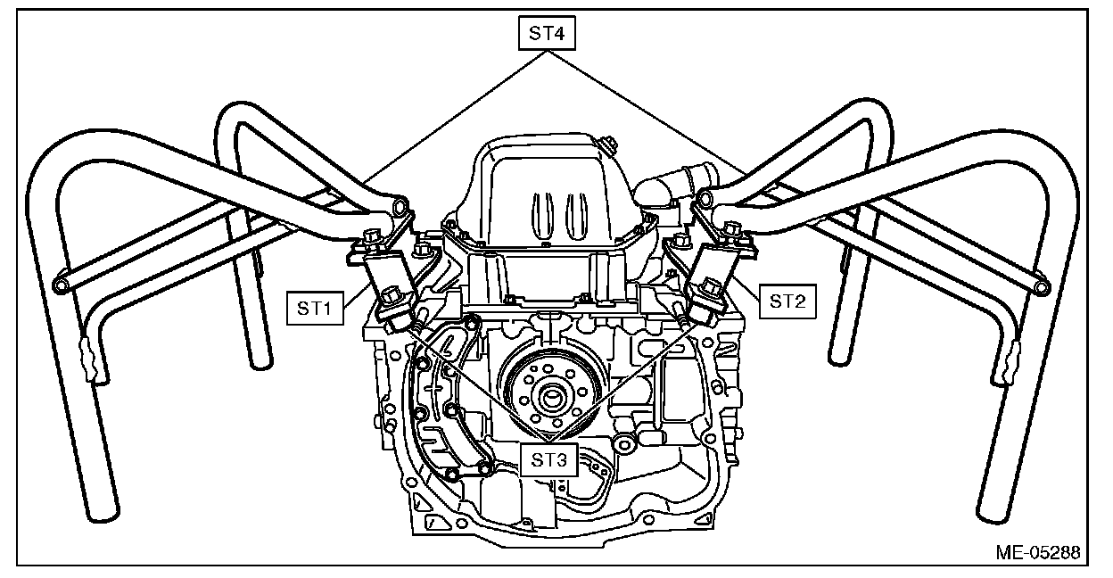 19) Set the cylinder block so that the oil pan is on the upper side, remove the ST1, ST2, ST3 and ST4 from cylinder block and oil pan upper.