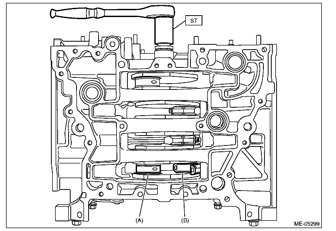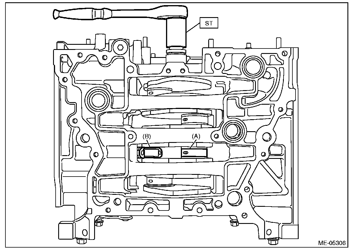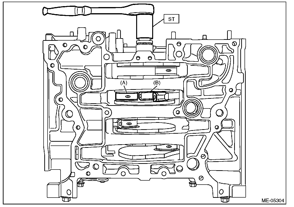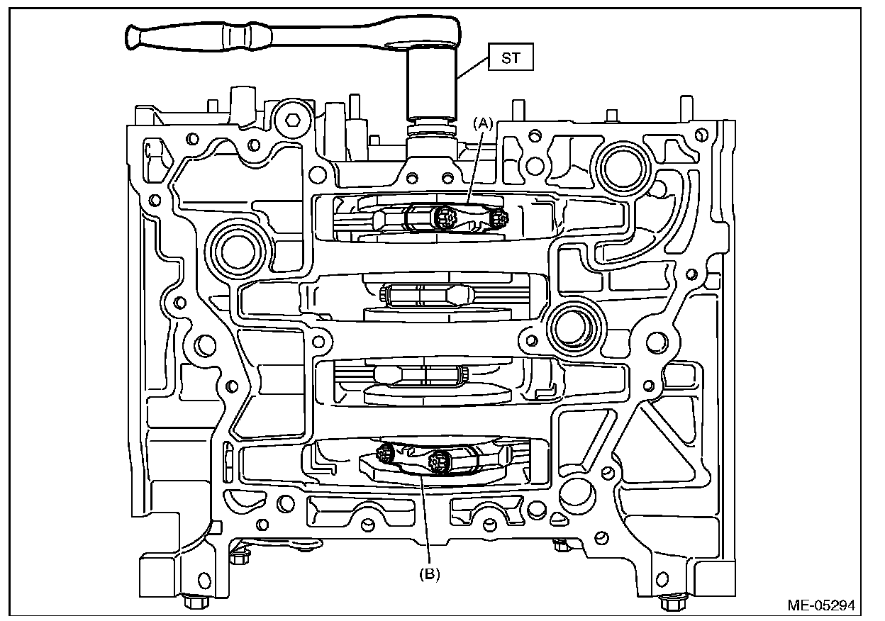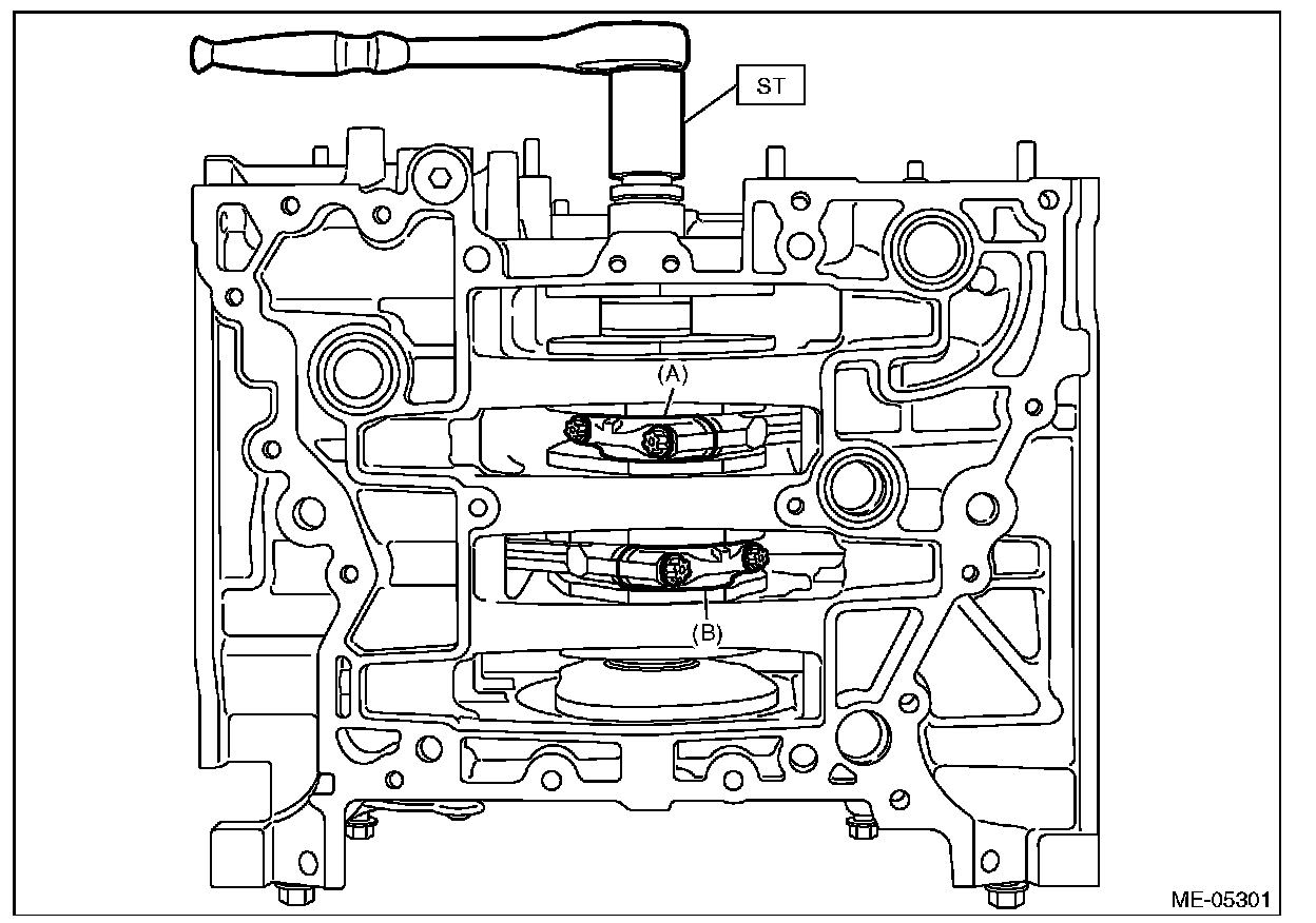 (1) Turn the crankshaft so that the #1 connecting rod cap (A) and #4 connecting rod cap (B) is located at the position shown in the figure using ST.
