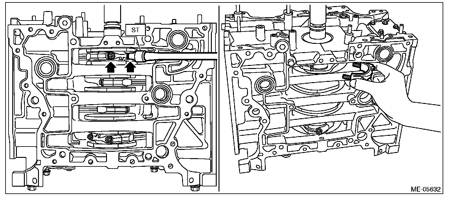 (2) Using ST, loosen the #2 connecting rod cap bolt, and remove the #2 connecting rod cap bolt and #2 connecting rod cap.