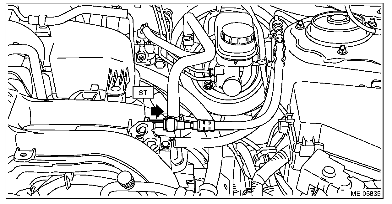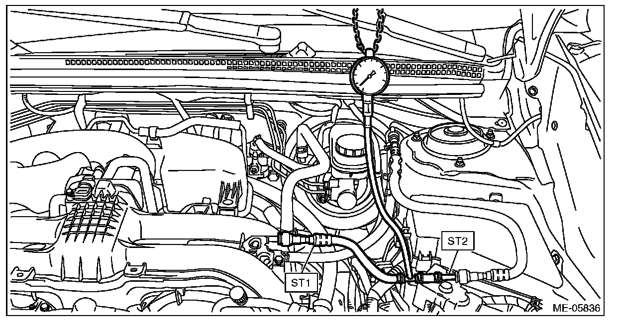 (2) Connect the fuel pressure gauge with ST1 and ST2.