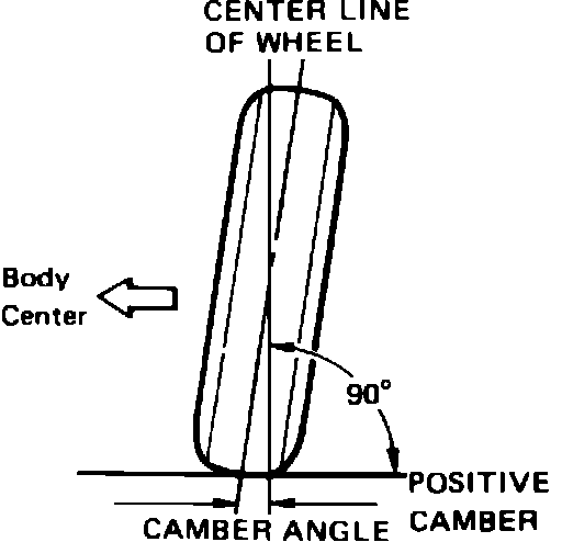 Camber is the tilting of front wheels from the vertical, when viewed from front of vehicle, Fig. 1. When the wheels tilt outward at the top, camber is positive. When wheels tilt inward at the top, camber is negative. Amount of tilt is measured in degrees.