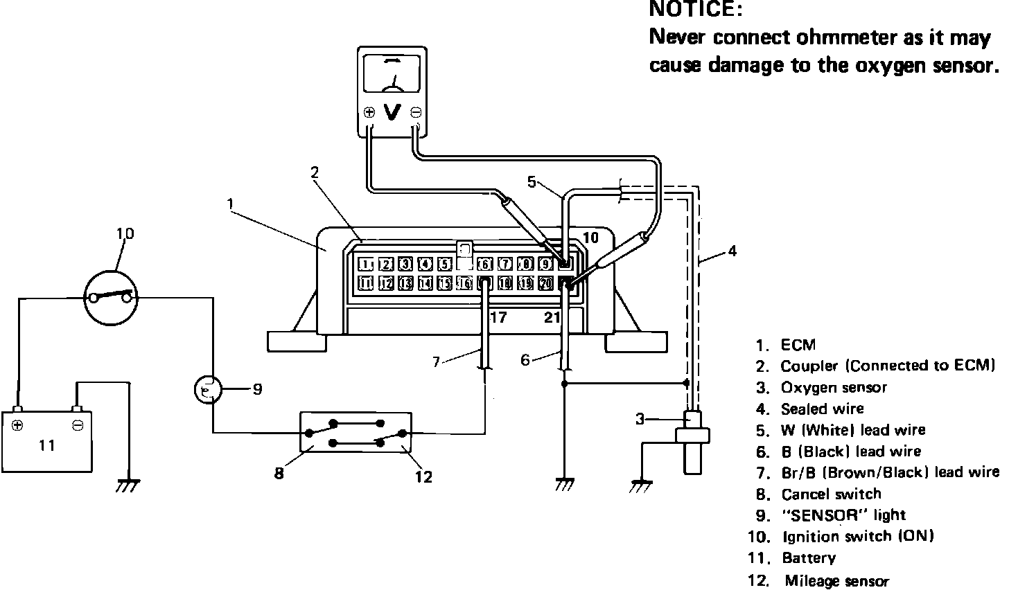 3. Connect voltmeter between terminals 10 (oxygen sensor signal) and 21 (ground), Fig. 20.