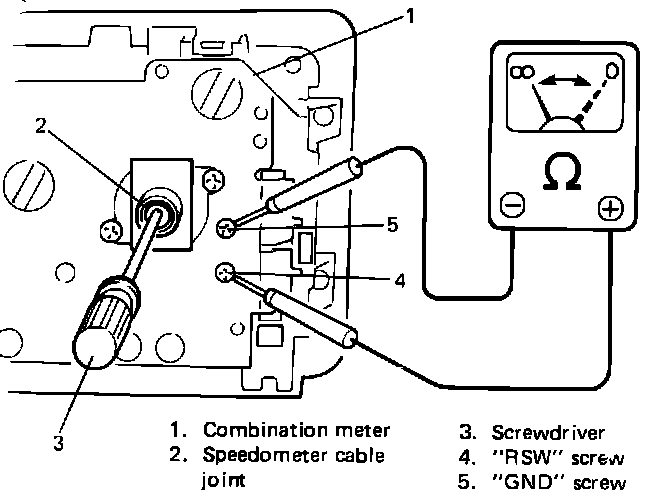 - Connect ohmmeter between "GND" screw and "RSW" screw of combination meter and turn cable joint of speedometer with a screwdriver.