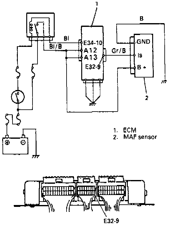 3) Connect voltmeter to "B+" terminal of MAF sensor coupler disconnected and ground.