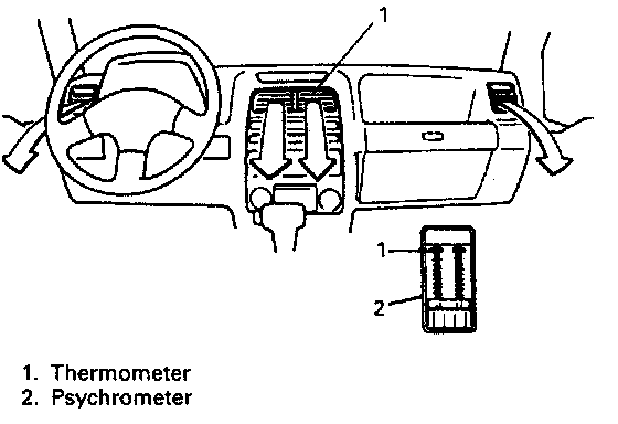 6) With about 20 mm (0.8 in.) of dry bulb thermometer inserted into center duct air outlet and another one set near evaporator air inlet, read temperature indicated on each thermometer.