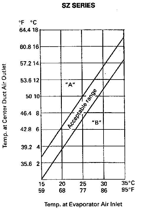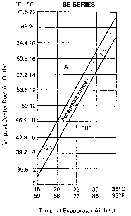 For example, if evaporator inlet port temperature is 25°C (77°F) and center duct air outlet temperature is 8.5°C (47.3°F), their crossing point is within acceptable range as shown in graph at the left.