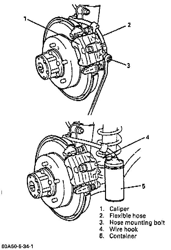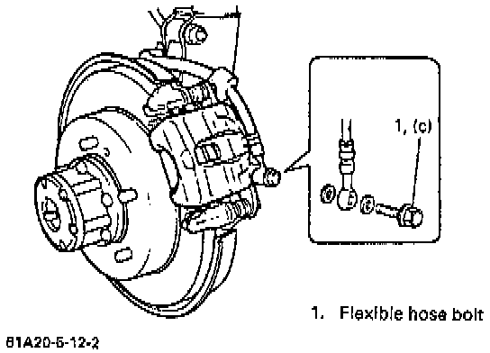 2. Remove brake flexible hose mounting bolt from caliper. As this will allow fluid to flow out of hose, have a container ready beforehand.