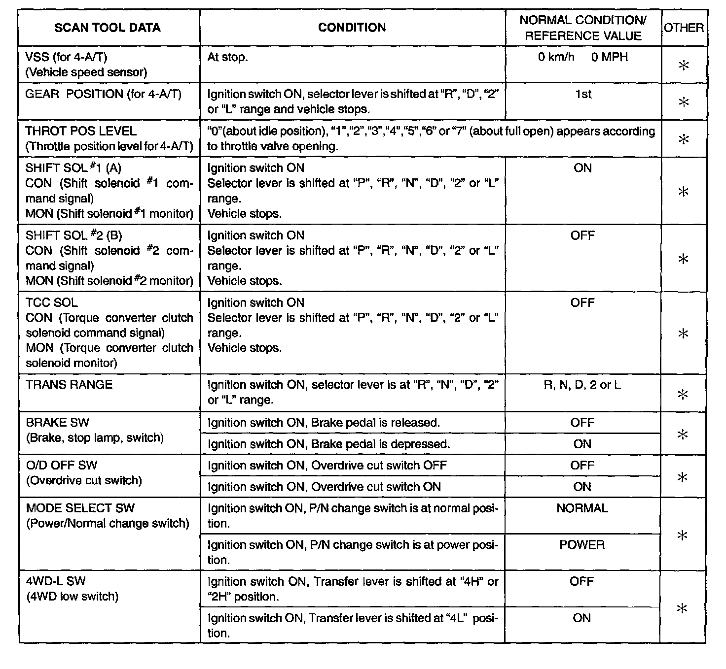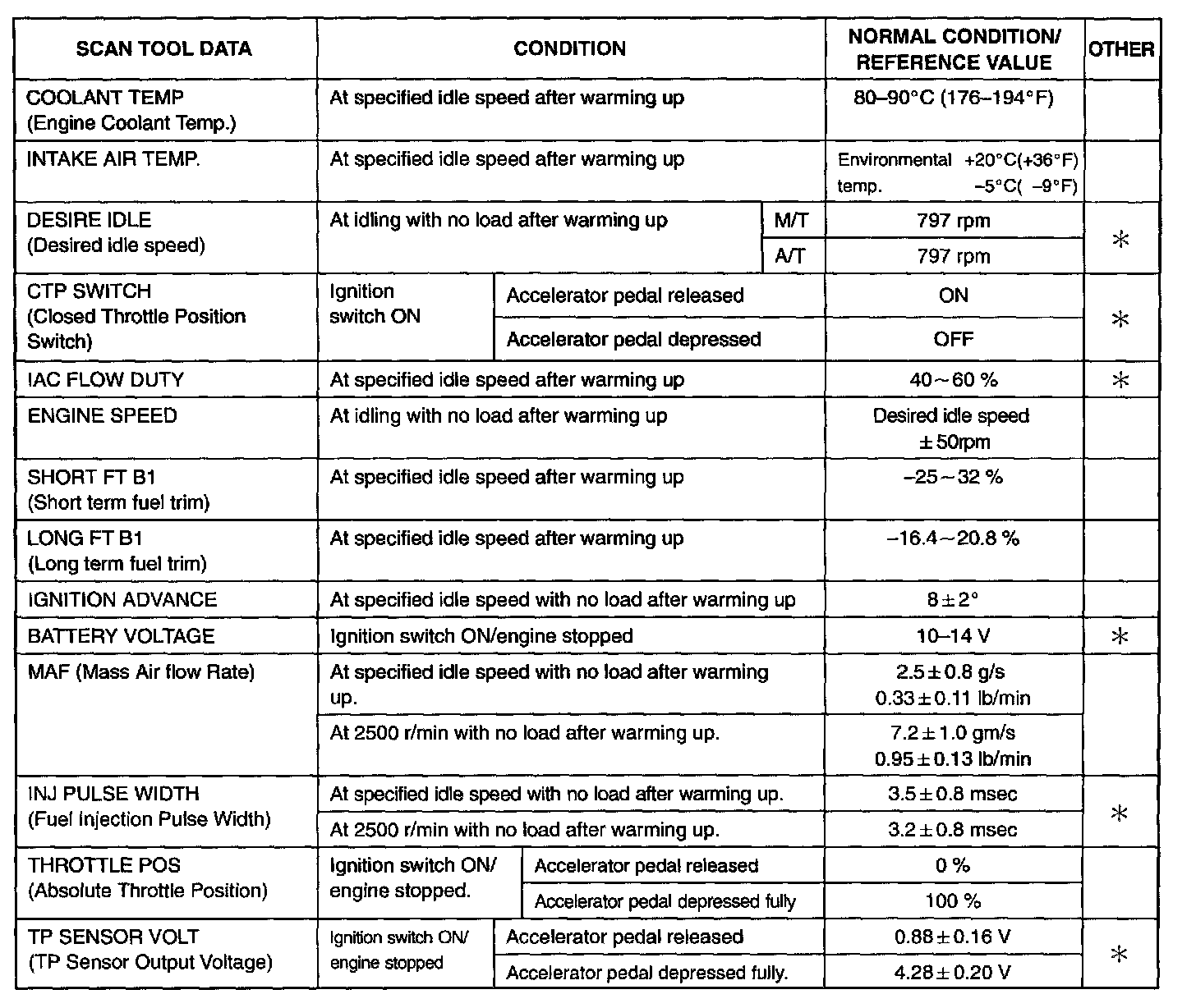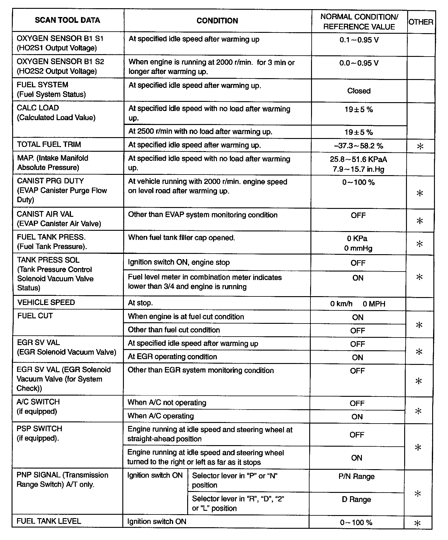 - For Asterisk (*) marked item in OTHER column, item can be read only by SUZUKI scan tool.
