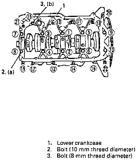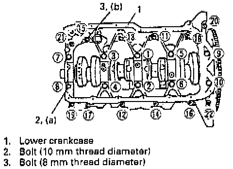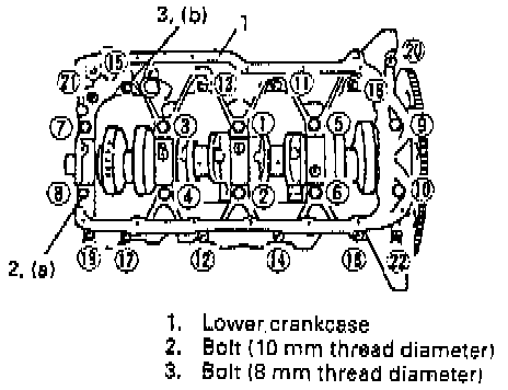 6. Install lower crankcase to cylinder block. Apply oil to crankcase bolts before installing them. Tighten crankcase bolts, following sequence in figure. Tighten crankcase bolts to specified torque.