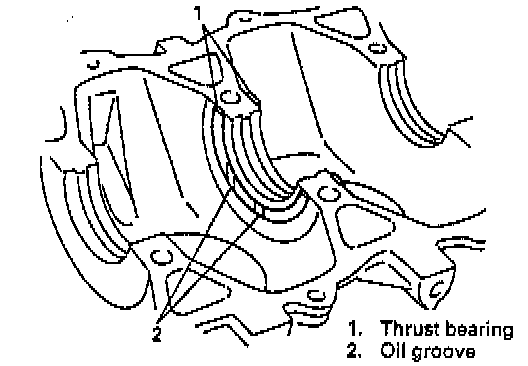 3. Fit thrust bearings to cylinder block between No.2 and No.3 cylinders. Face oil groove sides to crank webs.