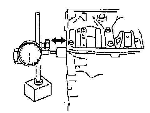 Use a dial gauge to read displacement in axial (thrust) direction of crankshaft.