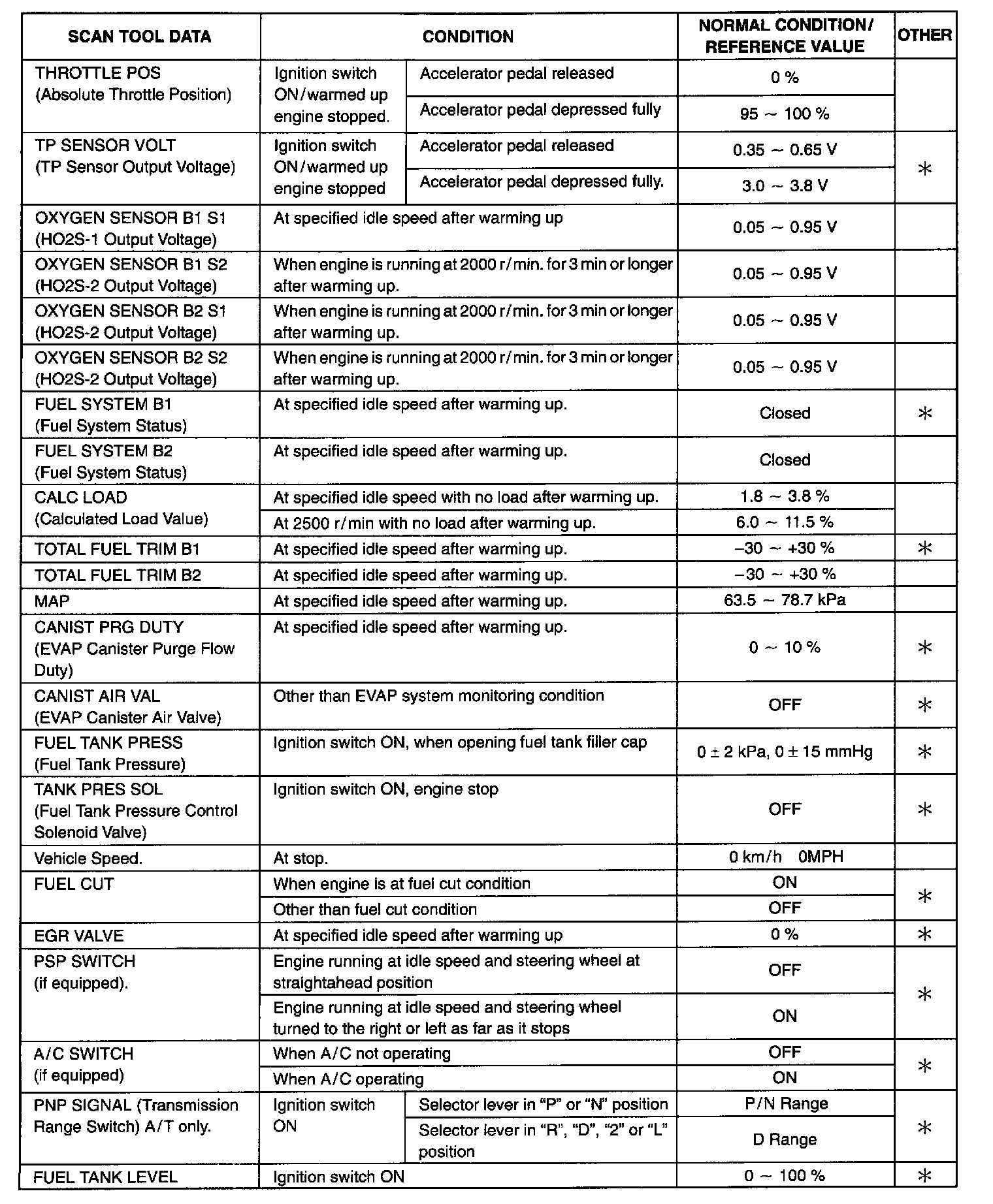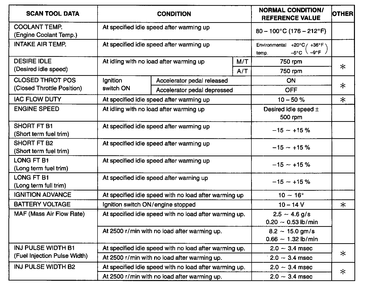 SCAN TOOL DATAAs the data values given below are standard values estimated on the basis of values obtained from the normally operating vehicles by using a scan tool, use them as reference values. Even when the vehicle is in good condition, there may be cases where the checked value does not fall within each specified data range. Therefore, judgment as abnormal should not be made by checking with these data alone.