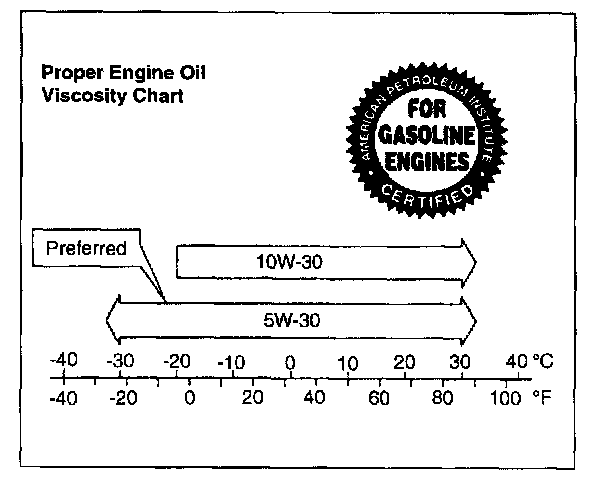 Use only engine oil with American Petroleum Institute (API) Certified For Gasoline Engines "Starburst" symbol. Select the appropriate oil viscosity according to the chart. It is highly recommended to use SAE 5W-30 oil. However, SAE 10W-30 oil is usable for ambient temperatures above -18 °C (0 °F).