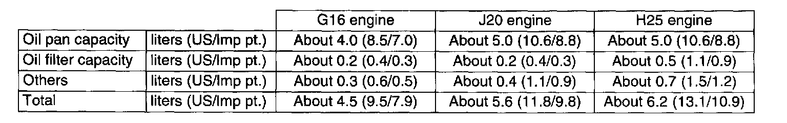 NOTE: Engine oil capacity is specified. However, note that the amount of oil required when actually changing oil may somewhat differ from the data in the table depending on various conditions (temperature, viscosity, etc.)