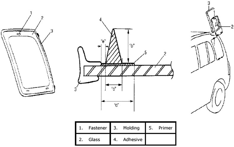 - Before applying primer to glass edge, install molding according to installing position shown in the figure.