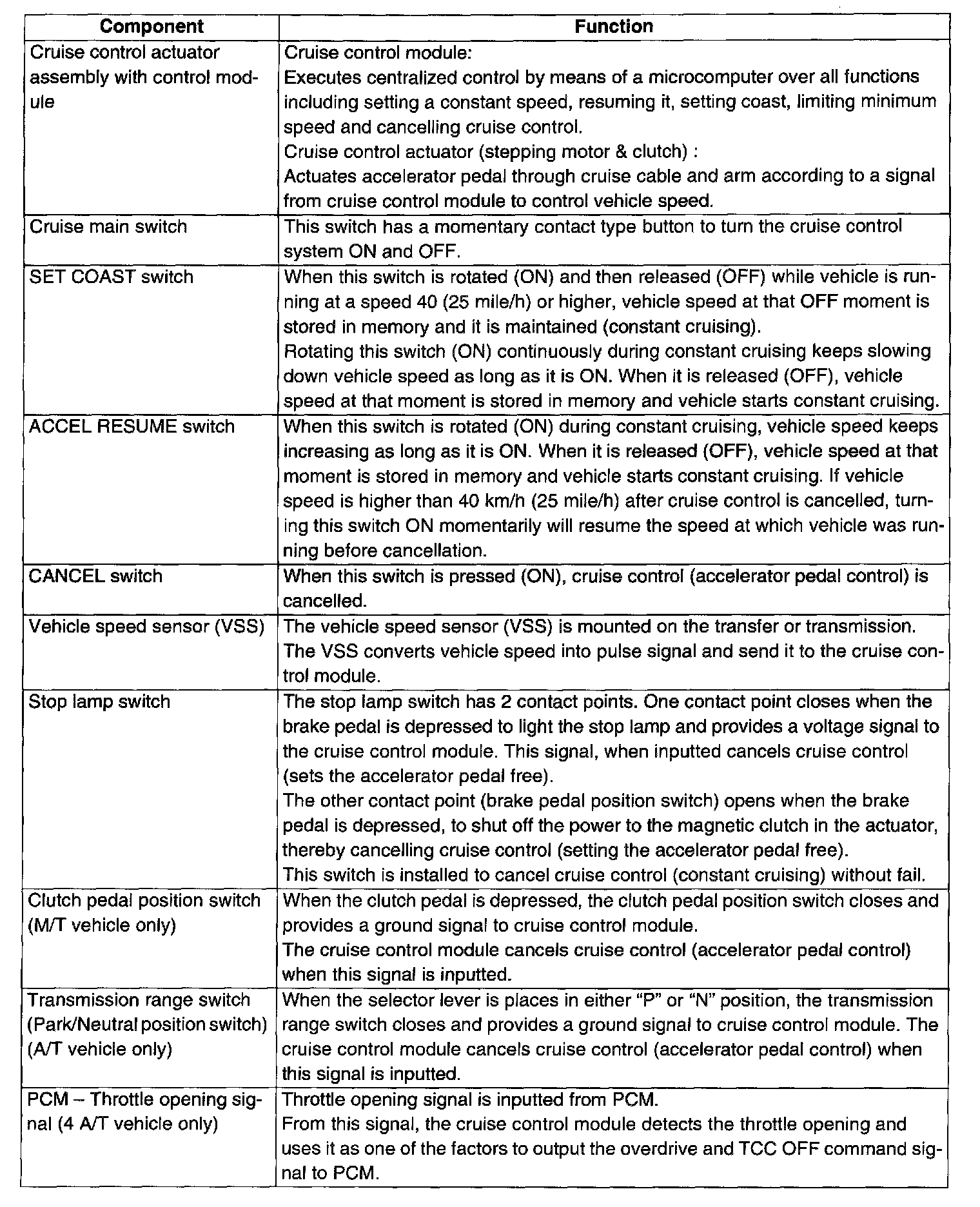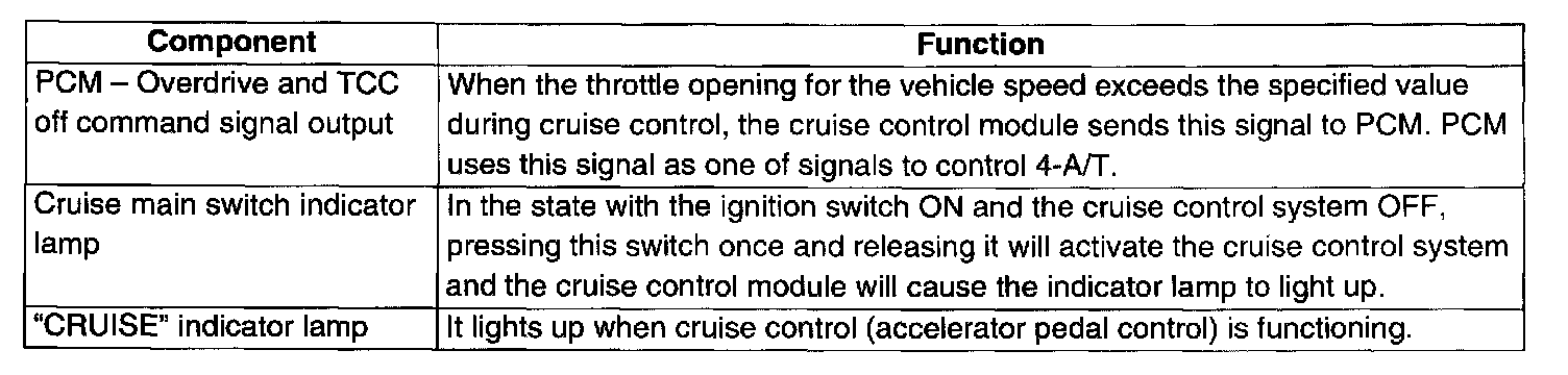 The cruise control system is a device which maintains a preset vehicle speed while driving at a high speed, e.g., on a highway. It allows the driver to drive his vehicle at a constant speed of 40 km/h (25 mile/h) or higher without depressing the accelerator pedal (constant cruising). The system also has such functions as to change the vehicle speed without operating the accelerator pedal (but using SET COAST and ACCEL RESUME switches), cancel cruise control (CANCEL switch) and resume the speed in memory automatically after cruise control is cancelled (ACCEL RESUME switch). The system mainly consists of a vehicle speed sensor, an actuator assembly incorporated with control module, cruise main switch, SET COAST switch, ACCEL RESUME switch and CANCEL switch, etc.