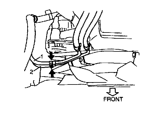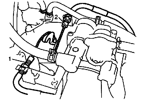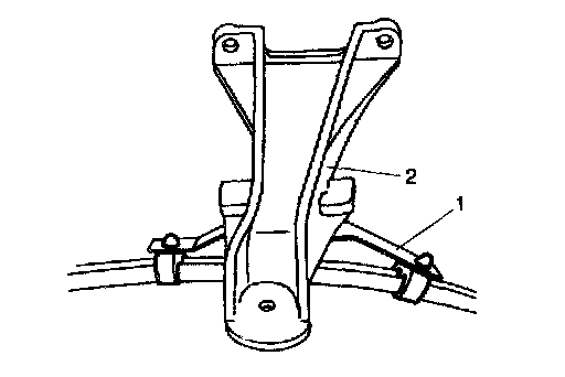 24. Remove A/T fluid hose clamps (1) from engine mounting bracket (2). (for A/T vehicle)