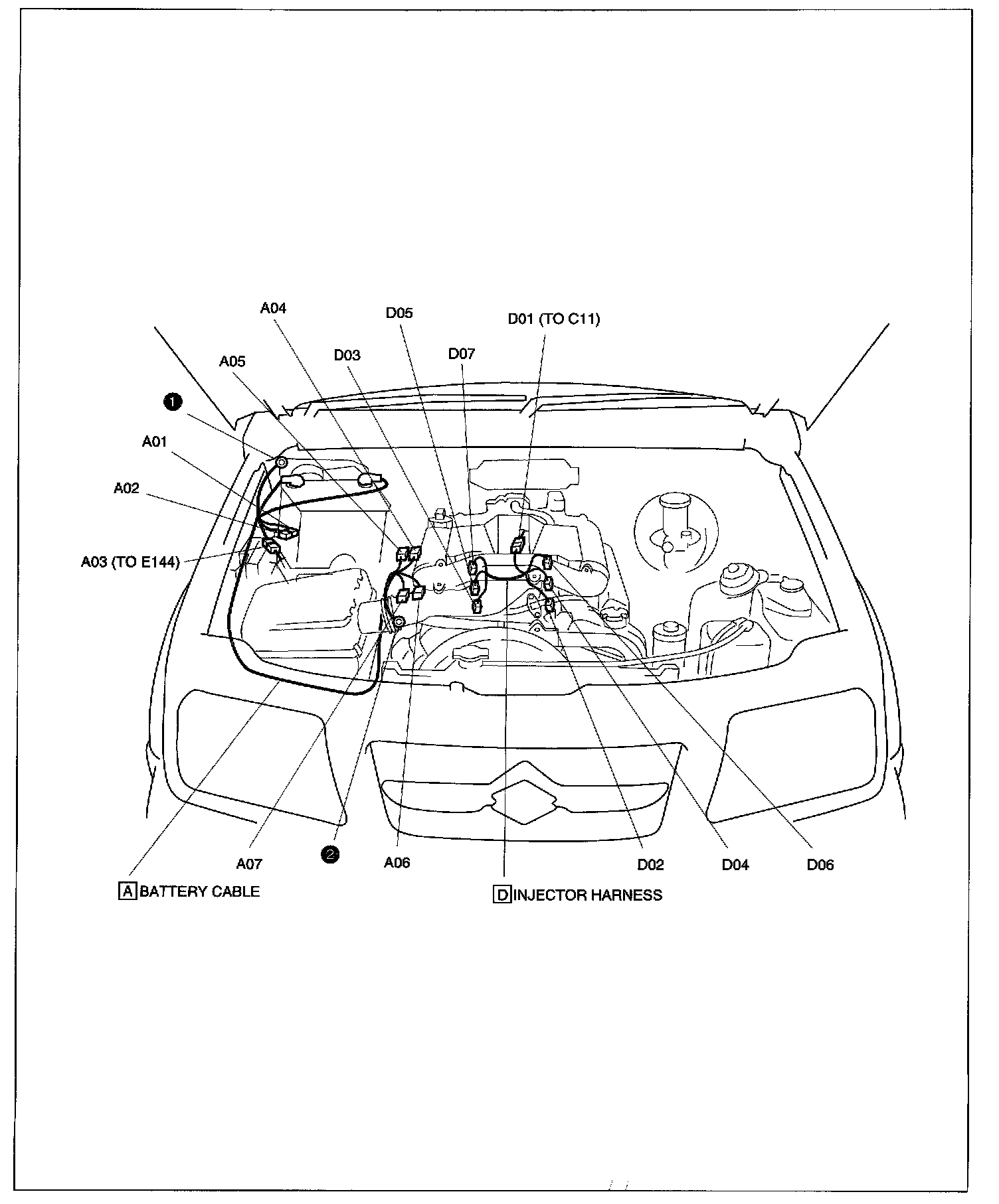 A: Battery Cable, D: Injector Harness Connectors: