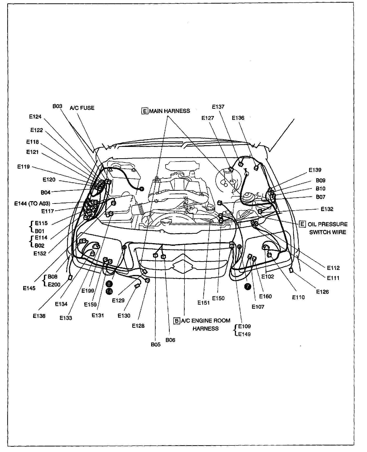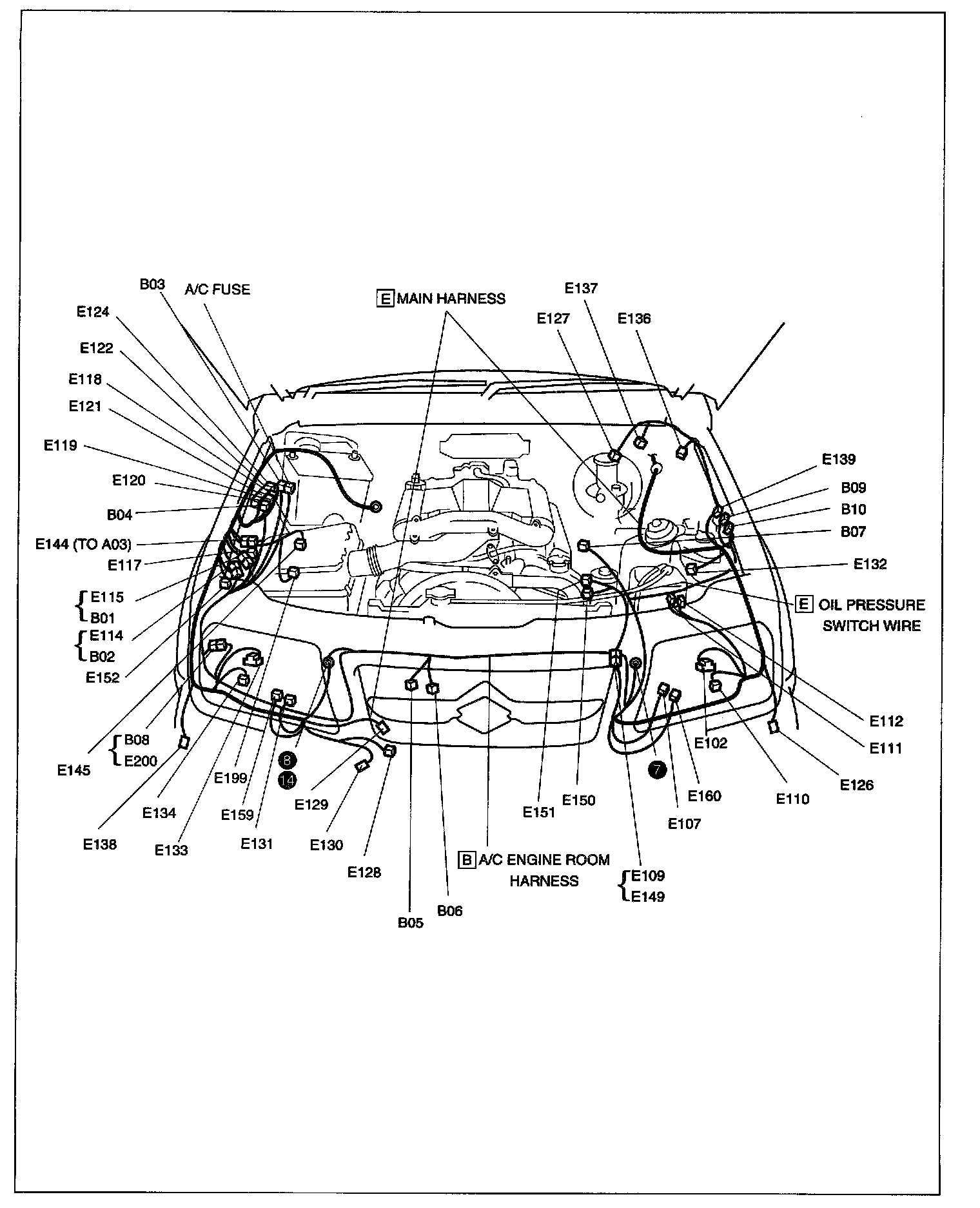 B: A/C Engine Room Harness, E: Main Harness, Oil Pressure Switch Wire: