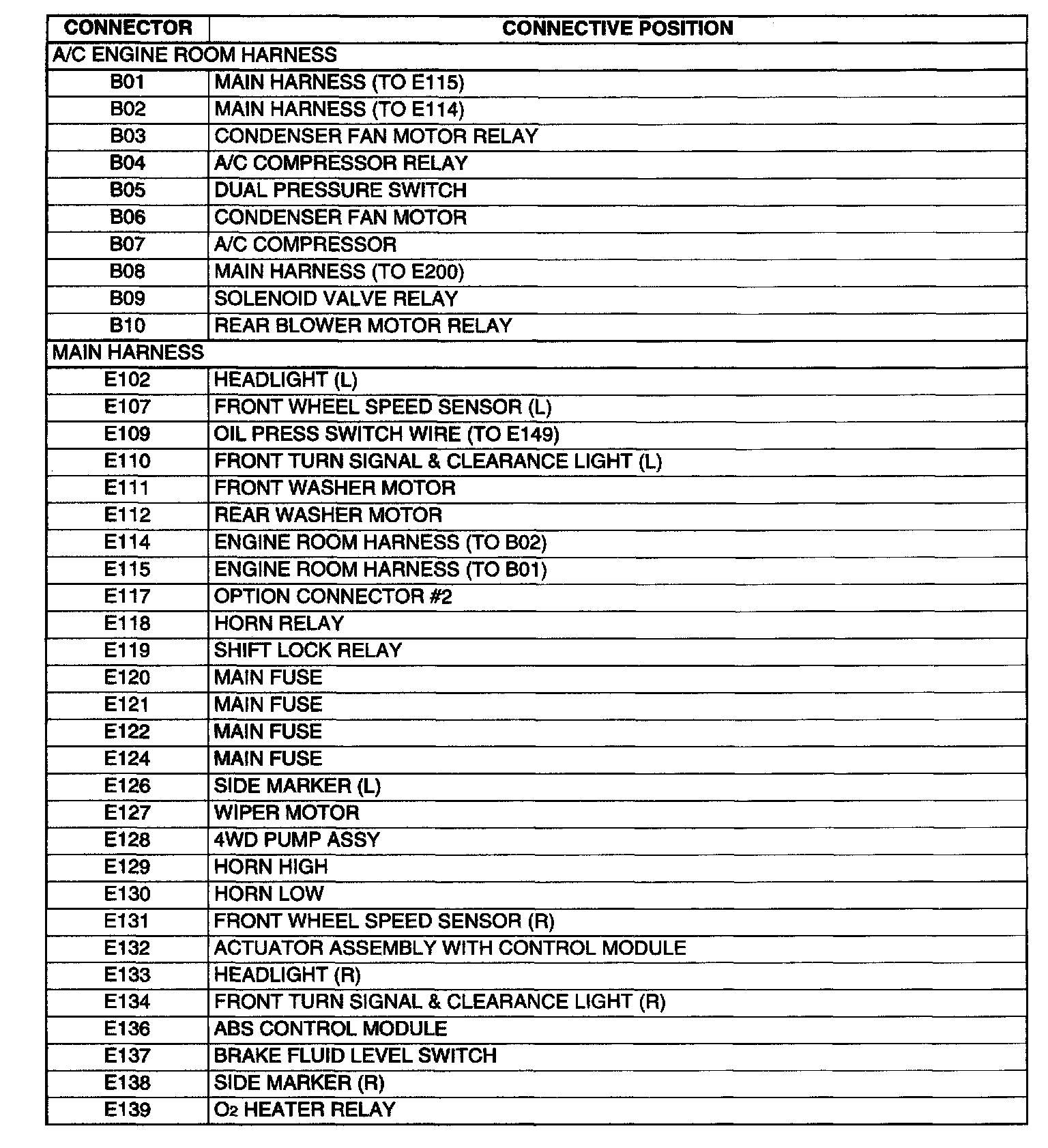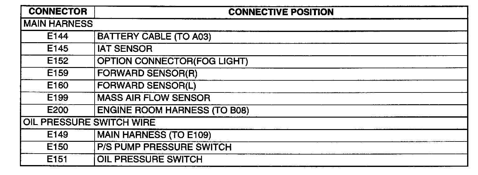 B: A/C Engine Room Harness, E: Main Harness Connectors: