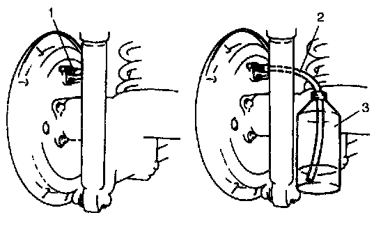 Attach a vinyl tube (see-through tube) (2) to bleeder plug of wheel cylinder, and insert the other end into container (3).