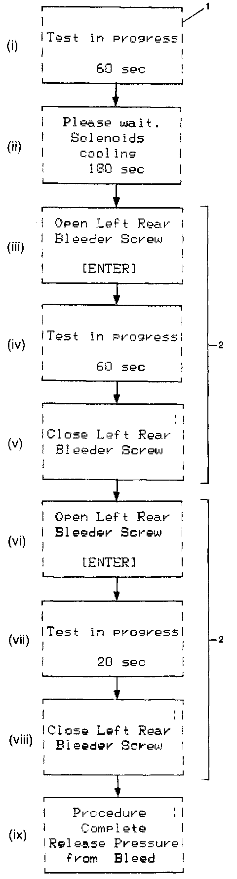 4. The first part of automated bleed procedure will cycle pump motor and front release valves for 1 minute (i).