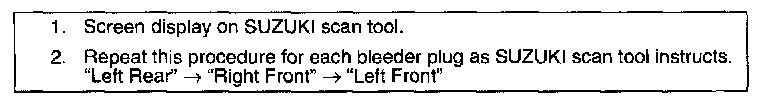 This procedure uses a SUZUKI scan tool to cycle the system valves and runs the pump motor in order to purge any air from the secondary circuits. These secondary circuits are normally closed off, and are only opened during system initialization at vehicle start up and during ABS operation. The automated bleed procedure opens these secondary circuits and allows any air trapped inside the BPMV to flow out toward the wheel cylinders where it can be purged out of the system.