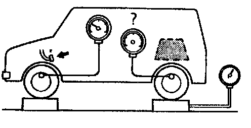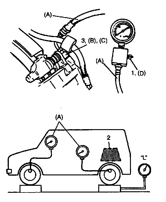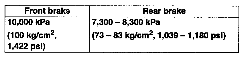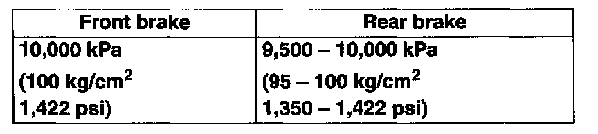 4. As done step 3), apply 100 kg/cm2 pressure to front brake and check that rear brake pressure then is within specification as given.