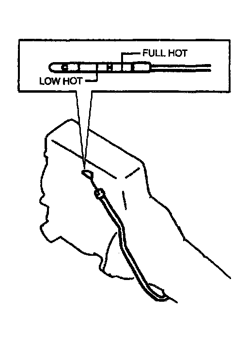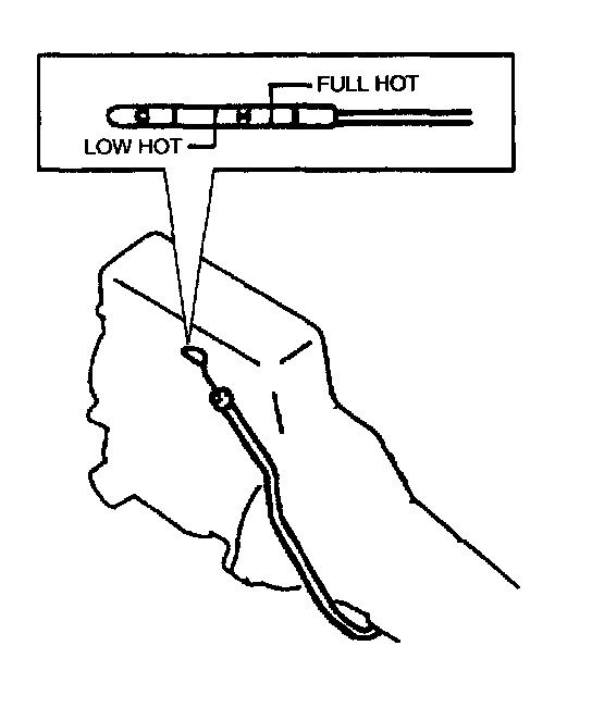 7. Pull out dipstick again and check fluid level indicated on it. Fluid level should be between FULL HOT and LOW HOT. If it is below LOW HOT, add an equivalent of DEXRON III up to FULL HOT.