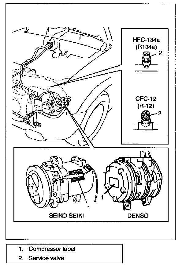 Whether the A/C in the vehicle being serviced uses HFC-1 34a (R-134a) or CFC-12 (R-12) is indicated on LABEL on the compressor. Also, it can be checked by the shape of the service (charge) valve.