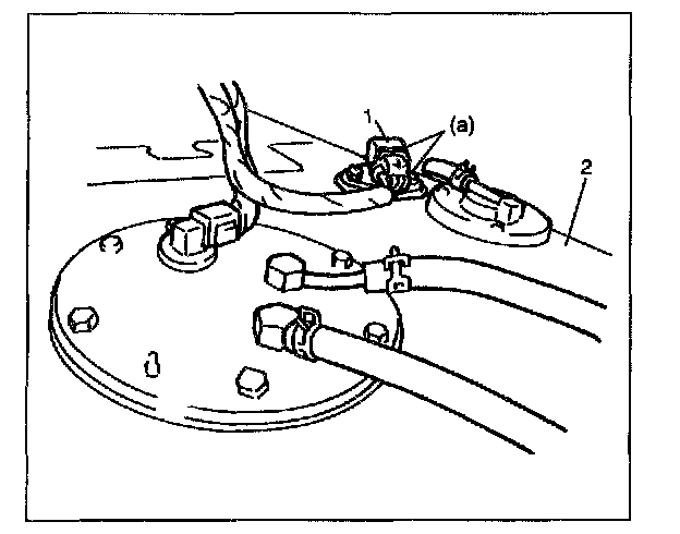 1. Install fuel tank pressure sensor (1) on fuel tank (2) directing sensor terminals to fuel pump side.