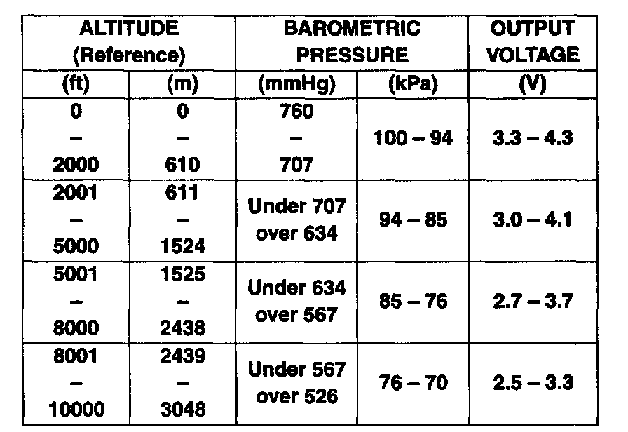 MAP sensor output voltage ("in voltage 4.5 - 5.5 V, ambient temp. 20 - 30 °C (68 - 86 °F))